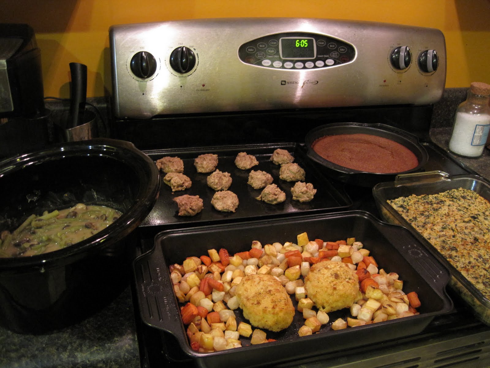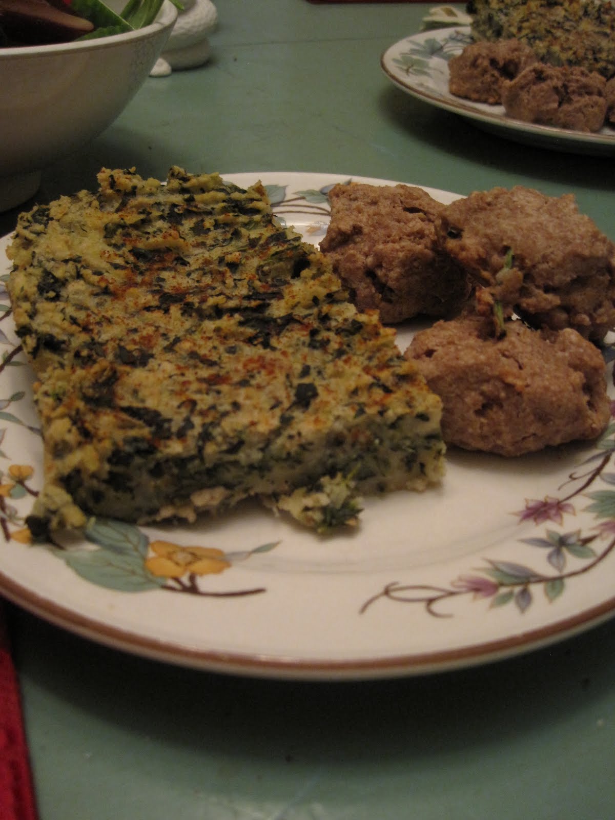 Clockwise from top left: Green Bean Casserole, Whole Wheat and Teff Chive Mini-Biscuits, Crustless Pumpkin Pie, Potato-Spinach Crustless Knishes, Roasted Root Vegetables, and Gardein Stuffed Turkey Roasts (which I did not make, of course).